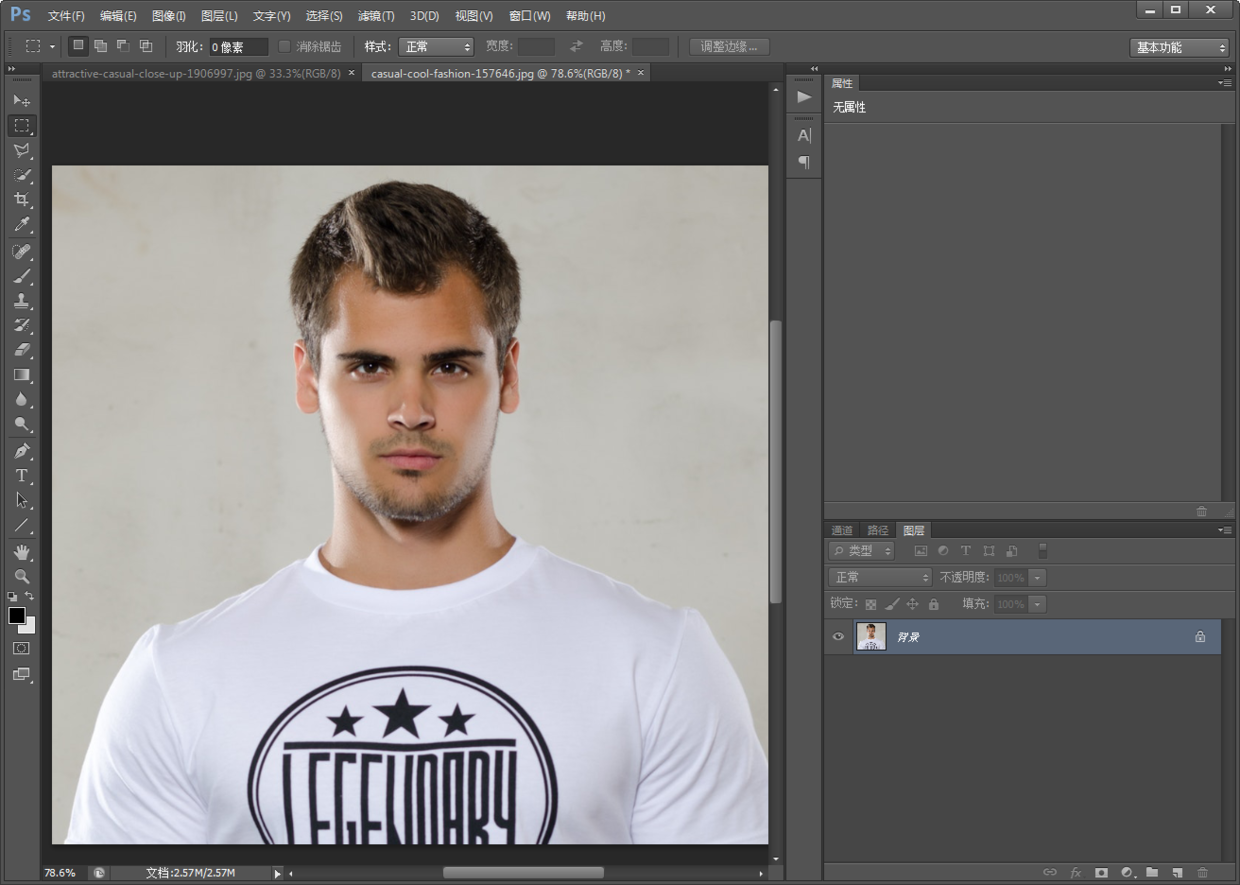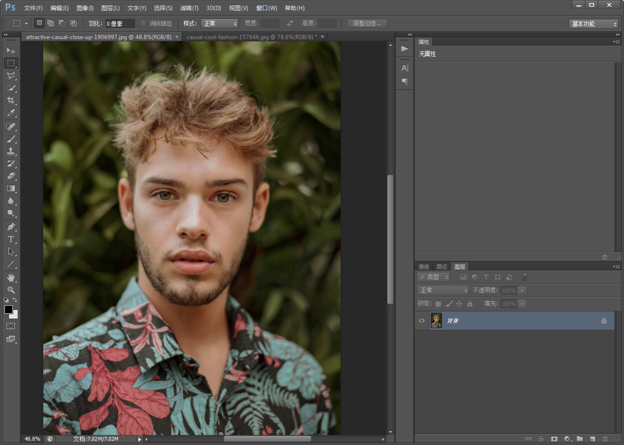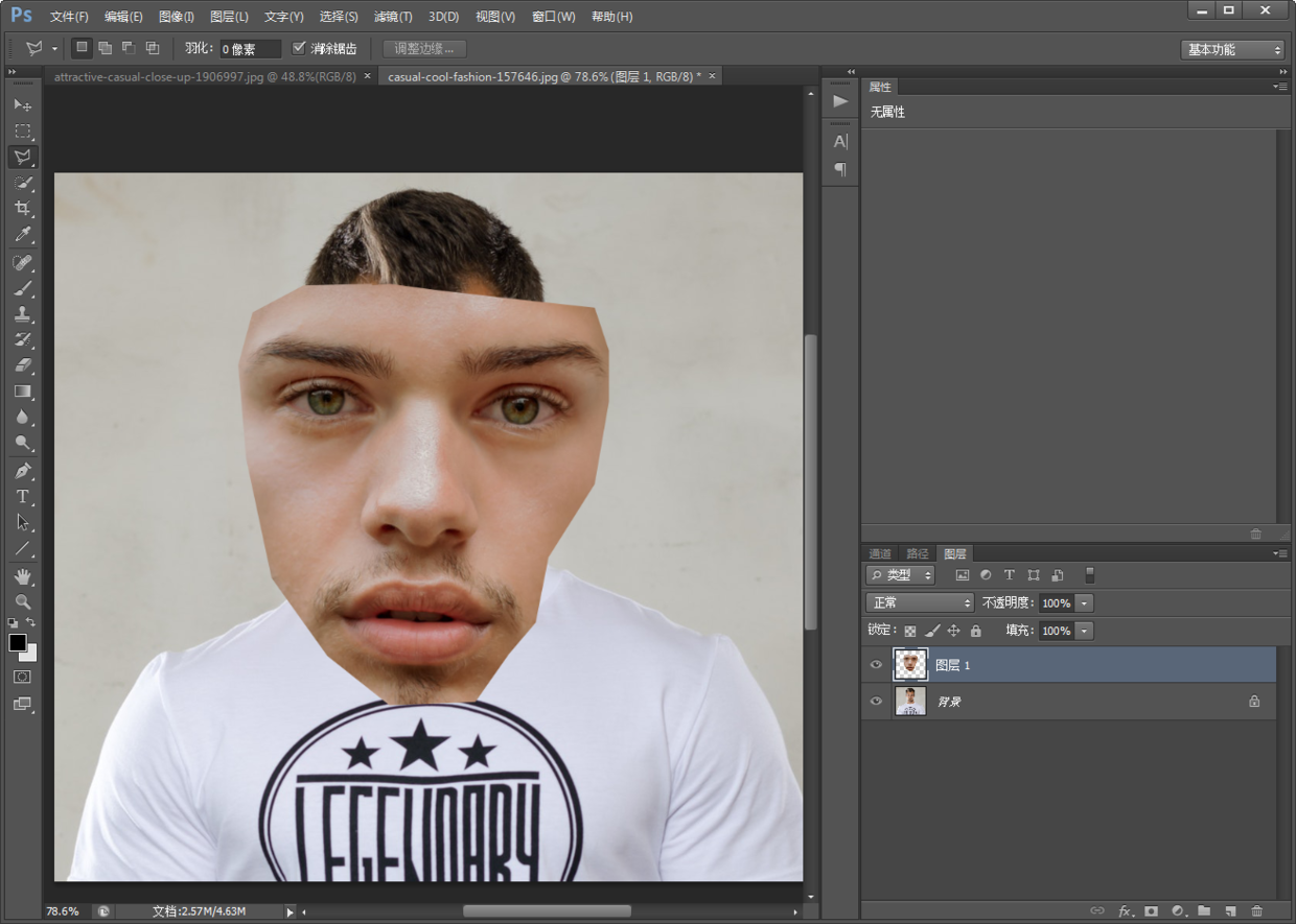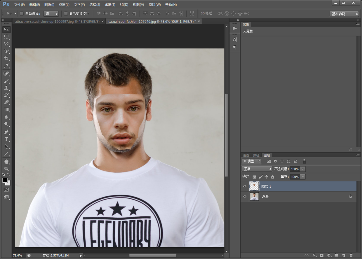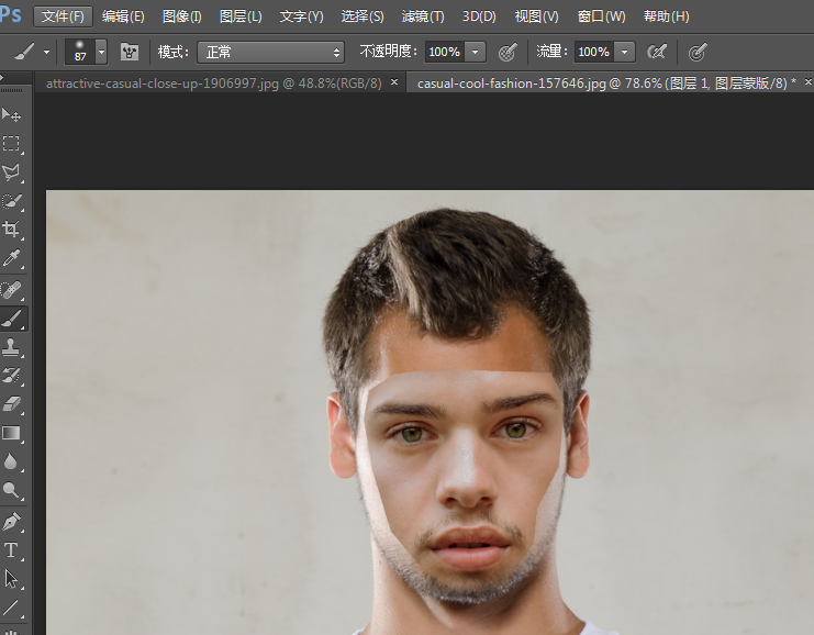 1.将两张人物素材图分别拖进PS中。人物素材图好选择同一方向的脸部,正面换正面,侧面换侧面,这样比较好换。刚开始练习建议不要选择脸部比较复杂的,例如眼镜,头发覆盖脸部的照片。