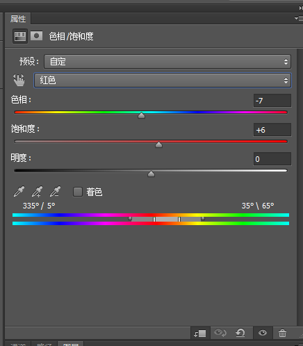 根据面部色调,选择红色,调节色相,往偏红去稍微一动一点,如下图右移-7;(想要知道移动后的颜色偏向,可以参考下方双排颜色区。)