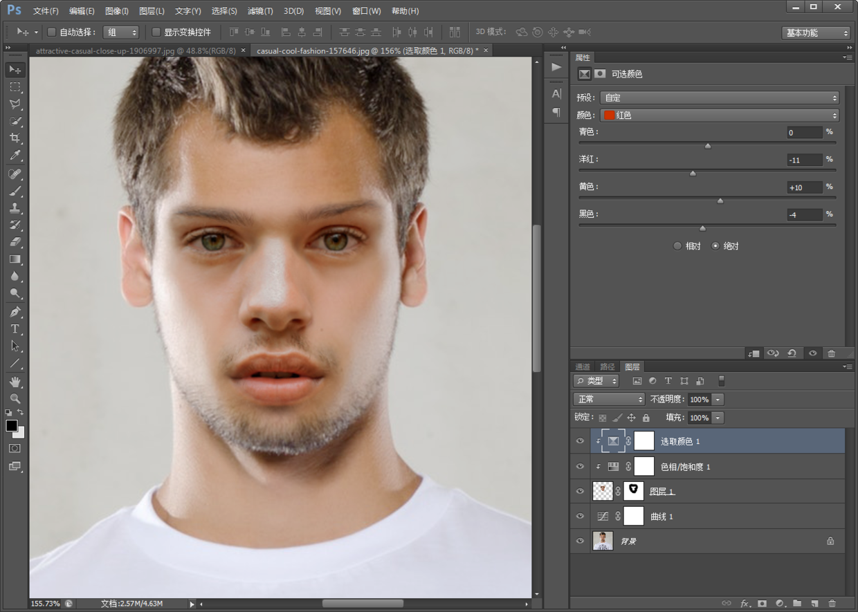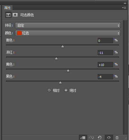 同样点击图层>新建调整图层>可选颜色;弹出的新建图层中,勾选使用前一图层创建剪贴蒙版;颜色选红色,移动洋红和黄色滑块,洋红调低-11,黄色调高10;再滑动黑色一点点-4,让面部颜色和额头也颜色更贴合一些。