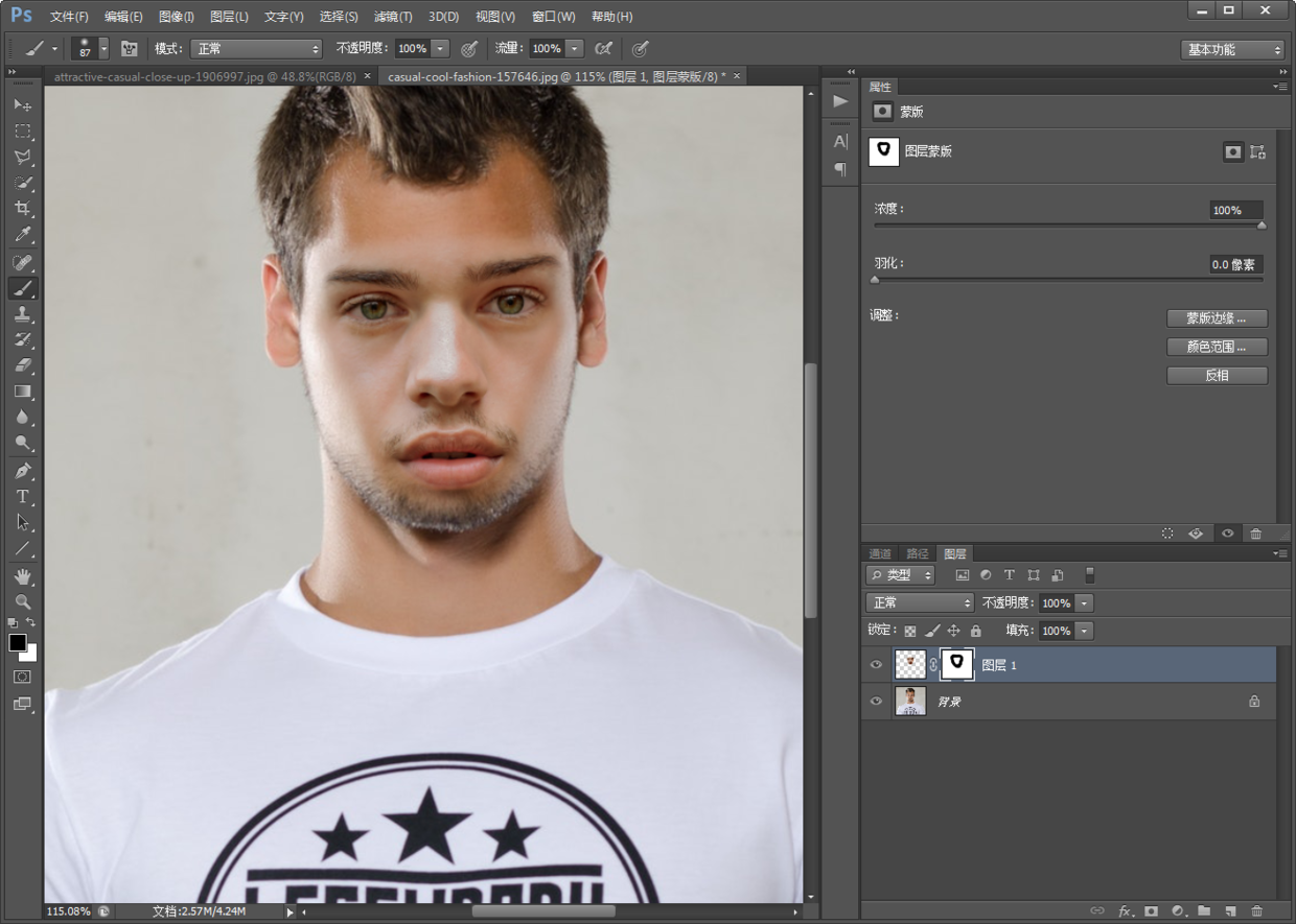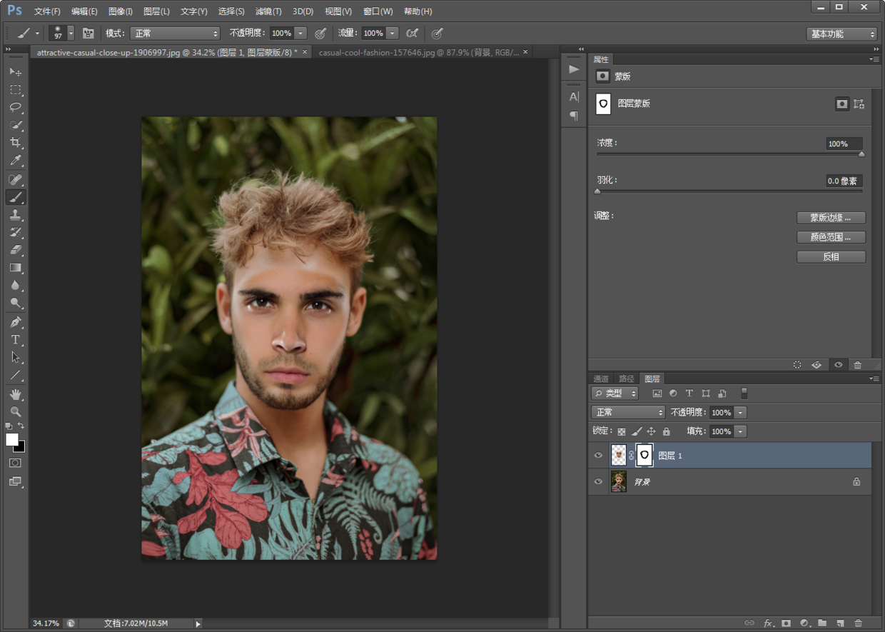 6.现在将白T的脸部换到花衬衫上;