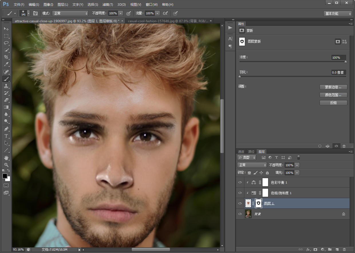 10.额头和右脸还有比较突兀的地方,用黑色柔边圆画笔在图层1的蒙版上进行涂抹,略微隐藏这些部位,得到下图。