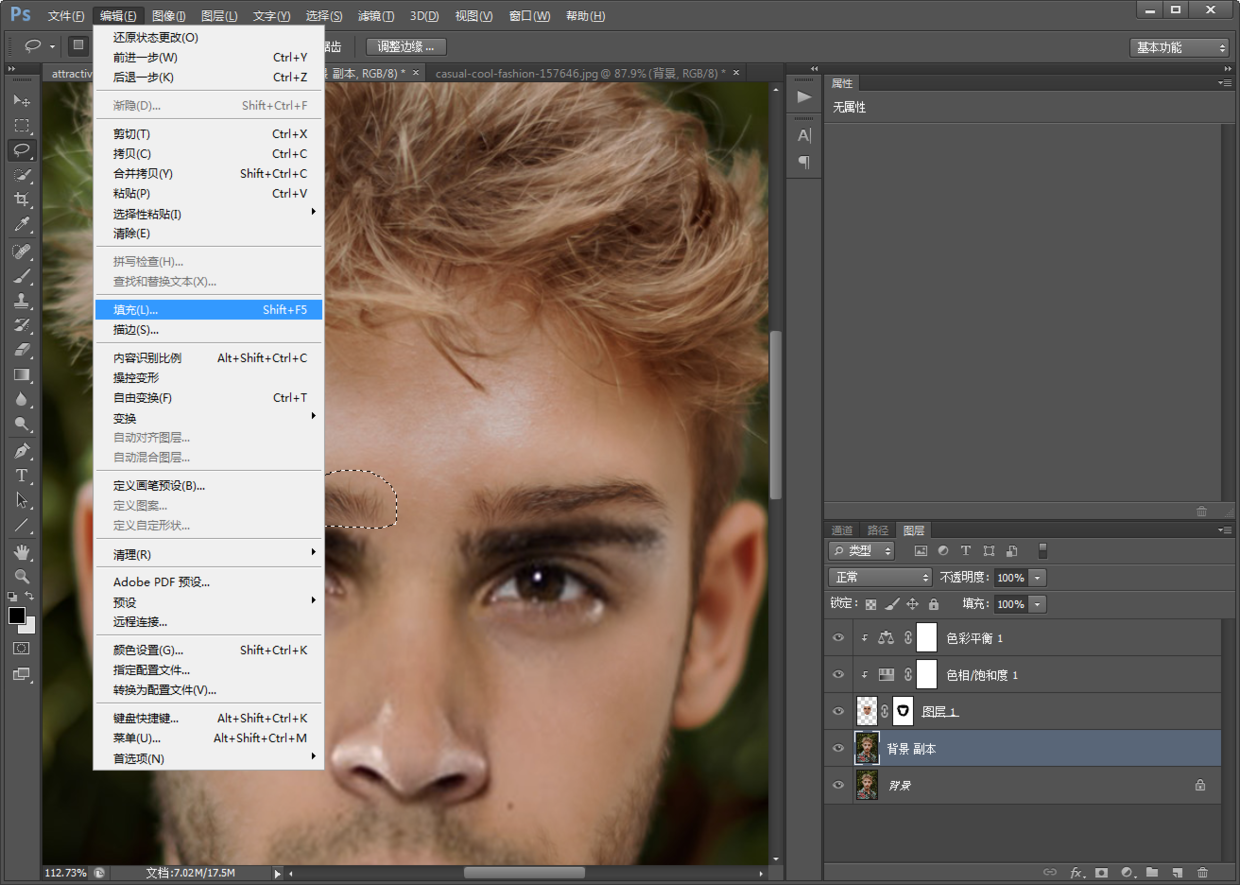 点击编辑>填充,其他默认,确认;