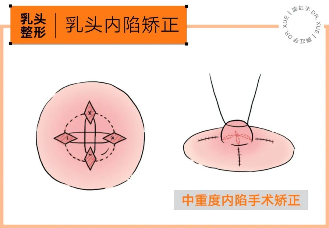 中重度乳头内陷则需要手术调节。如图在乳头四周的乳晕切除几个菱形组织,深至皮下;用缝线将乳头牵出、松解、皮下缝合,使乳头挺立;后将菱形切口逐一缝合。
