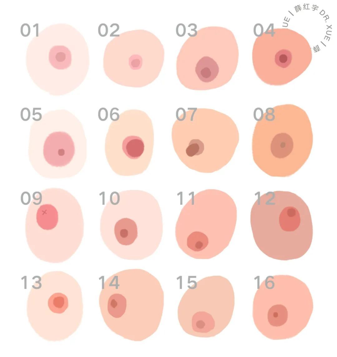 乳晕直径3-3.6cm;乳头直径0.8-1cm;乳头高度0.5-0.8cm,实际尺寸和胸部大小配合协调。临床中比较常见乳晕过大、乳头肥大、乳头内陷,本文介绍这几类问题的矫正方法。