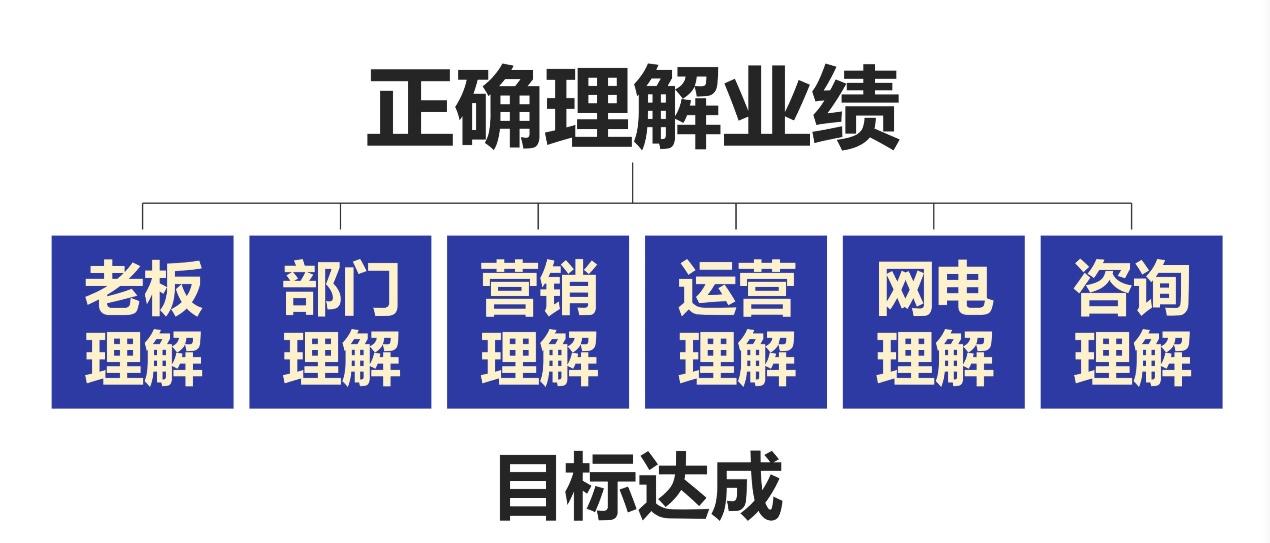 正确的理解业绩包含六个维度:老板理解,是指业绩的合理构成以及增长点在何处;部门理解,是业绩合理分解后的达成率;营销理解,是指业绩流量所支撑的人口;运营理解,是指如何进行产品组合、用多少产品来承接这个业务,其关注点在于业绩产品组合和新老客户占比;网店理解,是业绩的有效对话和到店指标;咨询理解,则是指业绩的有效成交和金额指标。