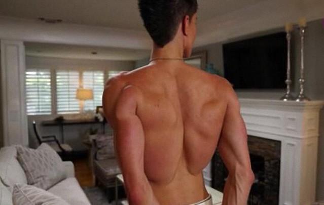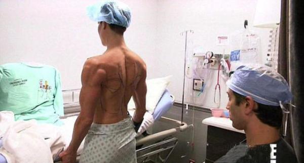图为:Justin Jedlica展示他植入了填充物的背部。他的背部显得特别的宽厚,远远看上去还真的像极了一对未展开的翅膀。