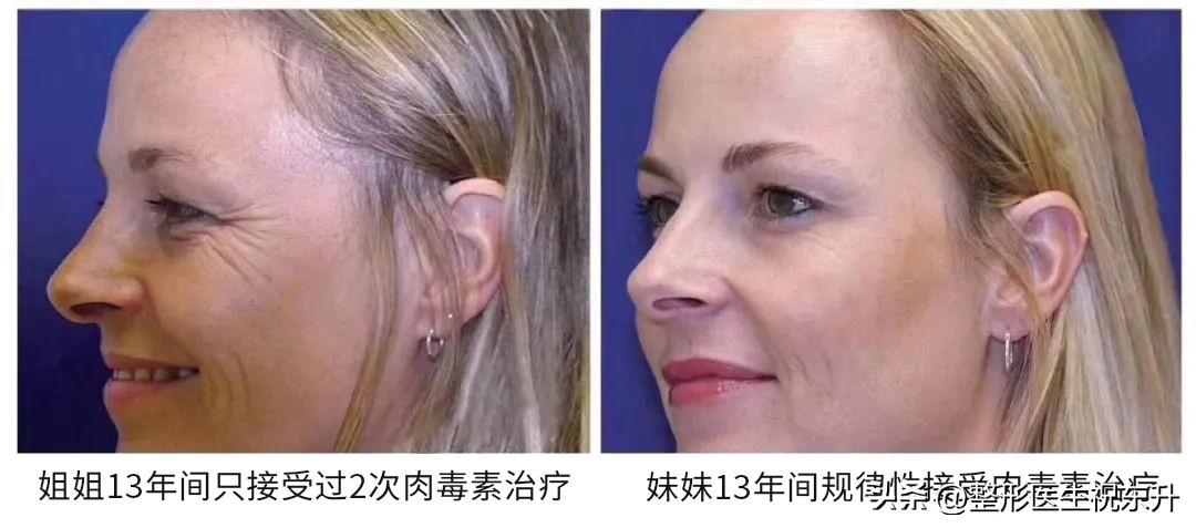 姐姐13年间只接受过2次注射除皱,妹妹13年间规律性接受注射除皱调节。你看看这两个人的面部状态有很的不同。