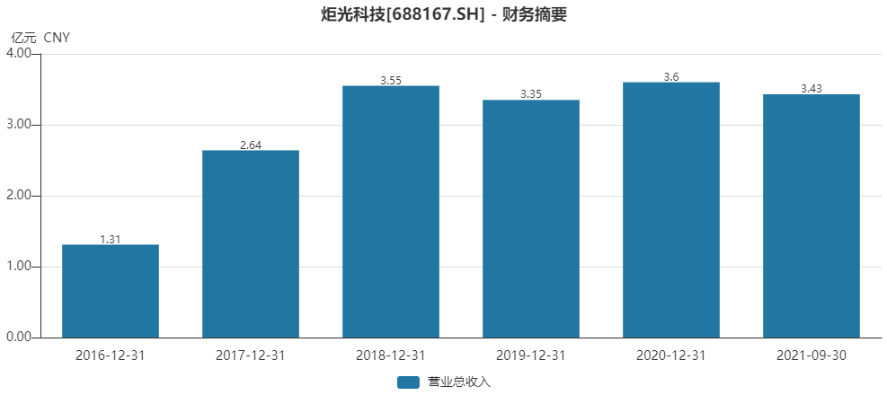 业绩方面,炬光科技营收从2016年的1.31亿元快速增长至3.55亿元,在随后的2019年和2020年增长基本陷入停滞。2021年前三季度,公司营收为3.43亿元,同比增长29.33%,重回增长态势。