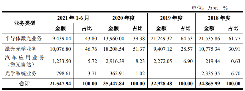 根据公司招股书的解释,“2020 年度和2021 年 1-6 月,半导体激光业务主营业务收入占比较以前年度下降,主要系受疫情影响下游市场需求减少。”