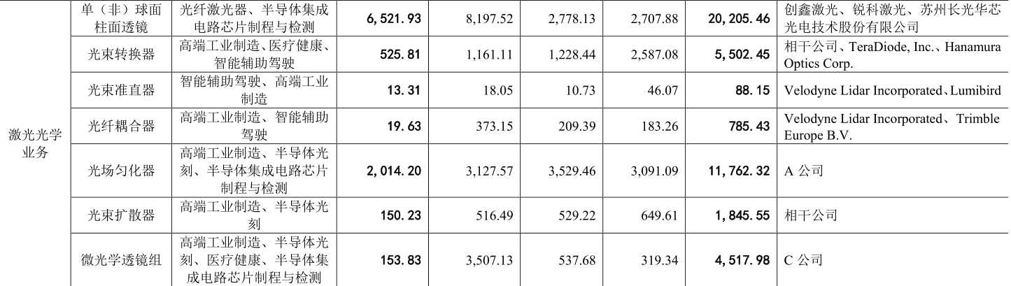 炬光科技目前业务处于激光产业链的上游和中游。在激光产业链上游覆盖了半导体激光元器件和激光光学元器件,中游则覆盖了包括激光雷达发射模组在内的光子应用模块和系统。