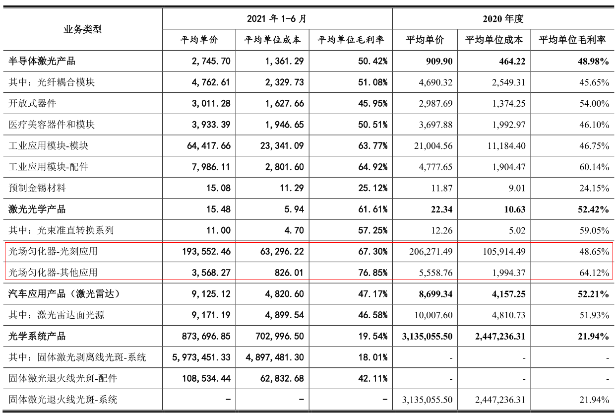 光场匀化器应用于国内主要光刻机研发项目和样机中,并供应给世界光学企业A公司,终应用于ASML的光刻机中。德国蔡司是ASML光刻机重要的光学零部件供应商,很有可能就是招股书中提到的供应商A公司。可以看到,光场匀化器单价在20万元左右,2021年上半年用于光刻和其他应用的毛利率分别为67.3%和76.85%,是所有产品中毛利率高的。从这个角度来说,LIMO有其特殊的战略价值。