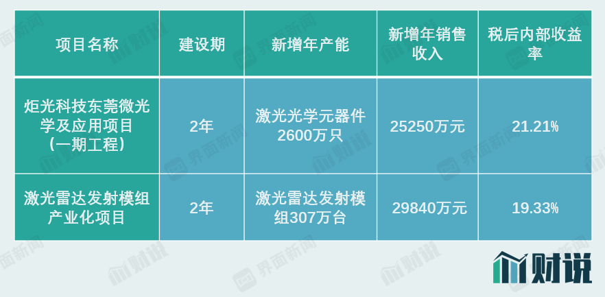 炬光科技此次IPO募投项目包括炬光科技东莞微光学及应用项目(一期工程)和激光雷达发射模组产业化项目,投产后将新增激光光学元器件2600万只和激光雷达发射模组307万台产能,对应新增年销售收入为2.52亿元和2.98亿元,这意味着投产后年收入将合计增加5.5亿元,相当于2020年收入3.5亿元的1.57倍。