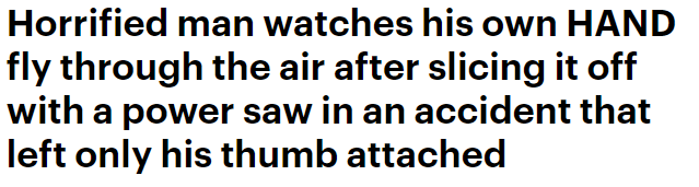 据悉,这起可怕的事故发生时,61岁的伊恩 · 霍斯利正在帮助一位老妇人清理棚屋。霍斯利先生正准备使用电锯切割材料,突然他的左手碰到了运转中的锯片,锯片划破了他的手掌,锯断了自己的手,只留下了他的大拇指。