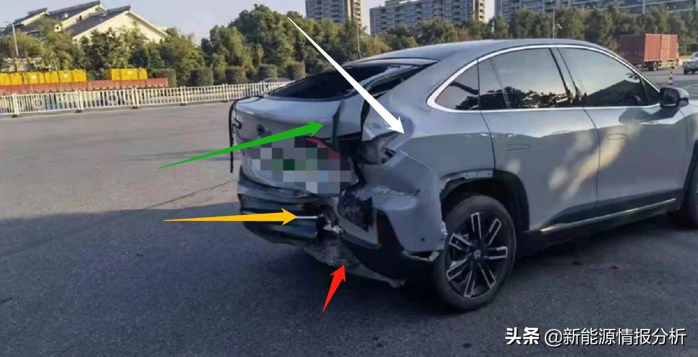 在碰撞中,江淮蔚来EC6的后背门(绿色箭头所指)损坏、车身焊接后侧围(白色箭头所指)损坏、车身焊接后围板(黄色箭头所指)损坏以及车身焊接后地板(红色箭头所指)损坏。