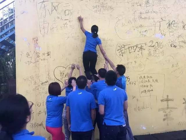 毕业墙:相互配合,互相沟通的能力。一堵4米的高墙,光滑、没有任何工具,要求所有的队员都翻越过去,才算胜利。一个人做不到,而团队可以做到!团队精神在这里得到体现!