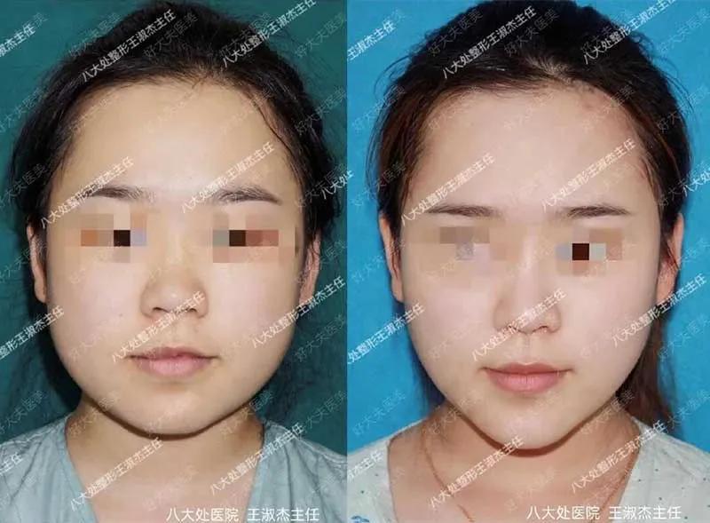 这位小美女觉得自己脸胖,下巴也短,脸型不好看,因为她的问题主要是颊脂垫肥厚,所以进行颊脂垫摘除+假体隆下巴综合改良,术后觉得脸型改良很大,很满意。