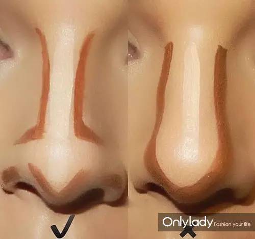 Step2:不少人会发现自己打完阴影鼻子依然很宽,那是因为你鼻子本身自带的阴影在作祟。把比肤色浅一些的遮瑕膏涂在鼻梁外侧的阴影部分,鼻子就会瞬间变窄啦!