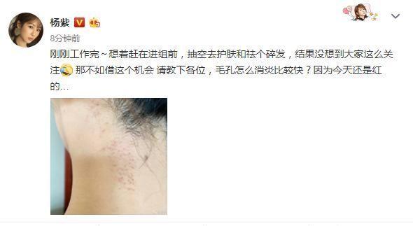 随后,她自己发微博回应出现在美容医院,是因为想着赶在进组前,抽空去护肤和祛个碎发,同时她也贴出了自己毛孔发炎的照片以证清白。