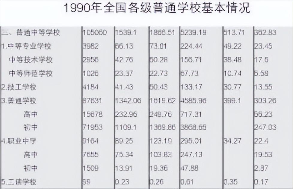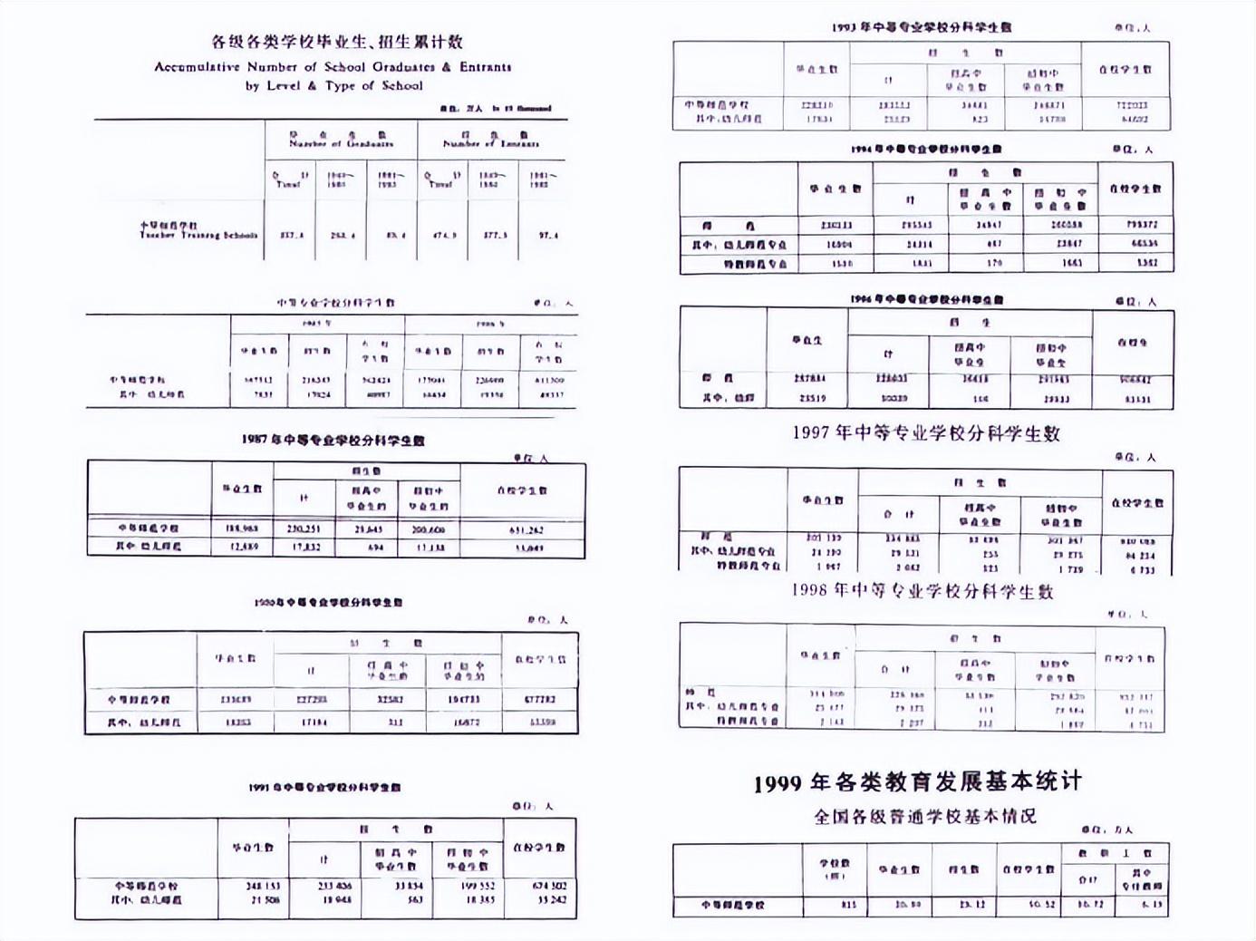 改革开放20年两大生源:1、高考挤桥末等生:1987-1998年均招生3万,1981、1982、1983、1984、1985、1986、1988、1989、1992、1995年份数据空缺,总量应在55万以上。2、初中少年定前程:1981-1985招生974000,1988、1989、1992、1995年份数据空缺,总量超370万。两者合计超400万,我们目光只盯喜气洋洋的初中生。