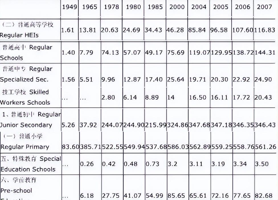 上表显示1949-1980年招生377.5万人,毕业268.4万人,淘汰率29%,1981-1985年招生97.4万人,毕业89.4万人,淘汰率8%,改革开放前三十年近三成学生未能毕业。