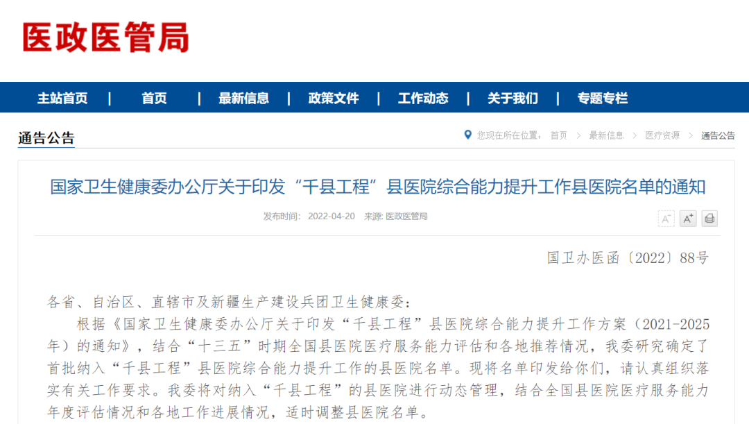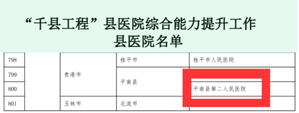 4月20日,卫健委发布《关于“千县工程”县医院综合能力提升工作县医院名单的通知》,平南县第二人民医院入选“千县工程”综合能力提升医院,成为首批“千县工程”示范单位。