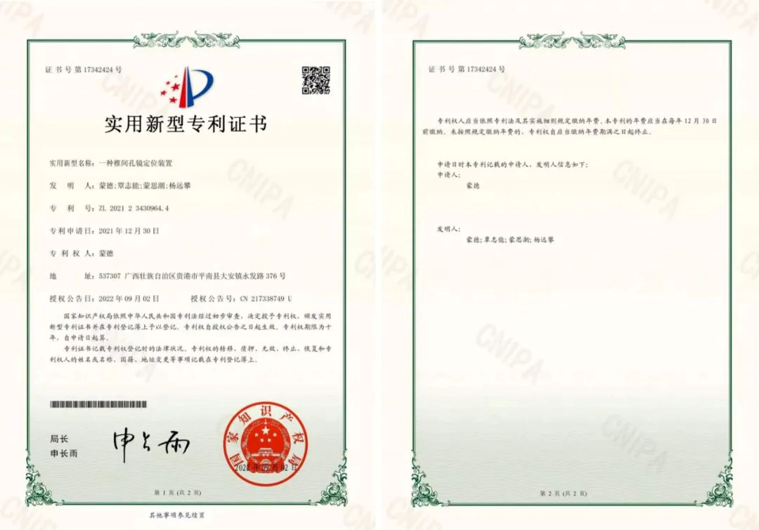 平南县第二人民医院脊柱关节骨病科主任蒙德带领团队研发的“一种椎间孔镜定位装置”及“一种脊柱椎弓根打钉位置定位装置”获实用新型专利证书。