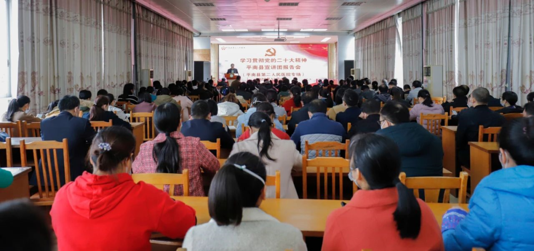 根据中国共产党平南县委员会宣传部《关于进一步做好学习贯彻党的二十大精神宣讲相关工作的通知》安排, 2022年12月8日下午,县宣讲团成员、县第六人民医院党支部书记、院长赵耀灿到我院开展学习贯彻党的二十大精神平南县宣讲团报告会(平南县第二人民医院专场),会议由党委副书记、院长邓兴昌同志主持,党政领导班子成员、全体党员和中层干部共150多人参加宣讲报告会。