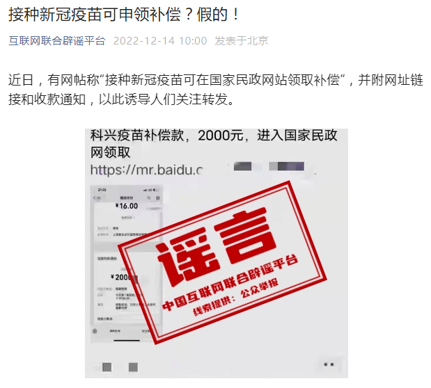 打疫苗可以领钱?假的!近日,一则“接种新冠疫苗可在民政网站领取补偿”消息在网络平台流传,并附网址链接和收款通知,引发部分网民关注转发。