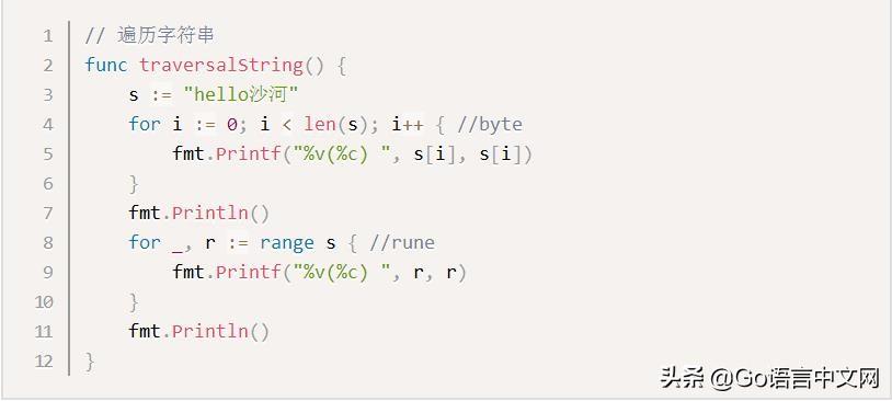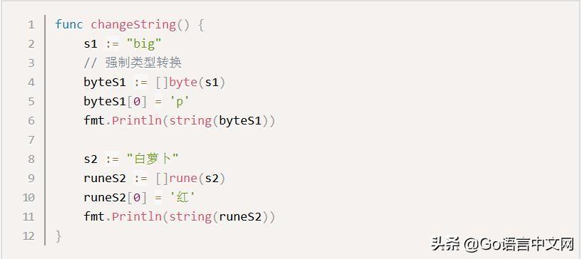 要修改字符串,需要先将其转换成[]rune或[]byte,完成后再转换为string。无论哪种转换,都会重新分配内存,并复制字节数组。