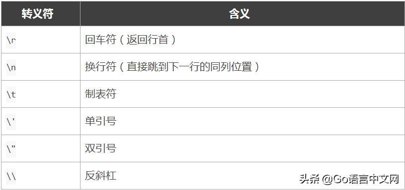 Go 语言的字符串常见转义符包含回车、换行、单双引号、制表符等,如下表所示。