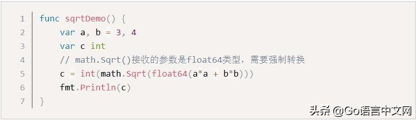 比如计算直角三角形的斜边长时使用math包的Sqrt()函数,该函数接收的是float64类型的参数,而变量a和b都是int类型的,这个时候就需要将a和b强制类型转换为float64类型。