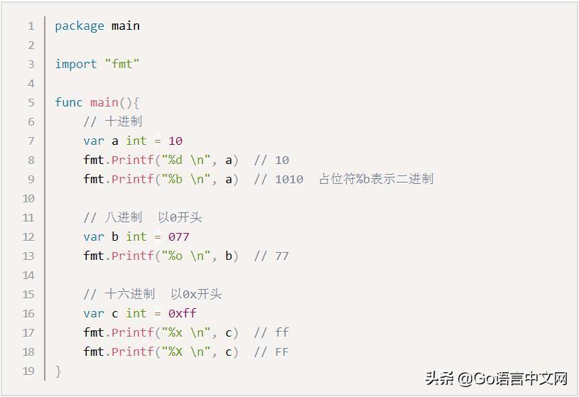 Go语言中无法直接定义二进制数,关于八进制和十六进制数的示例如下: