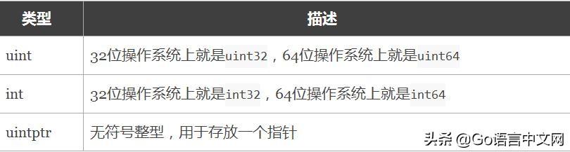 注意: 在使用int和 uint类型时,不能假定它是32位或64位的整型,而是考虑int和uint可能在不同平台上的差异。