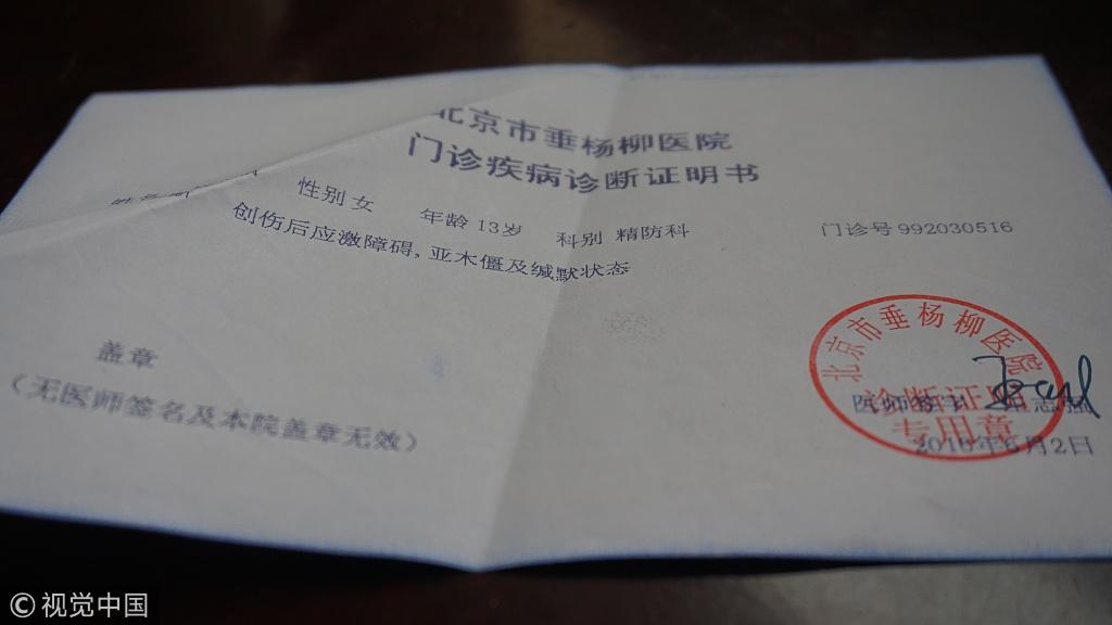 北京市垂杨柳医院诊断,她的症状为“创伤后应激障碍”、“亚木僵”。到其他医院住院调节了一段不见好,父母又带她去北戴河。