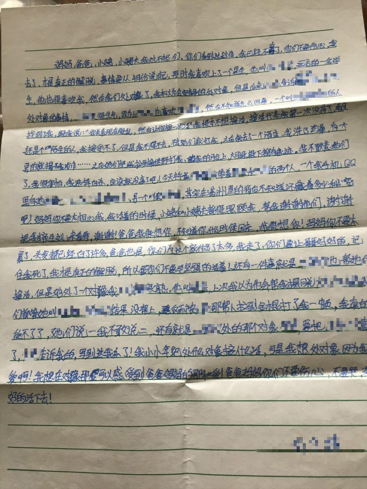 那段时间,她一出门,就感到很多双眼睛盯着自己。她在遗书里写,“我想处对象,因为我缺爱”。她还提到了爸爸,写了两遍“我很想你,不知什么时候回来”。