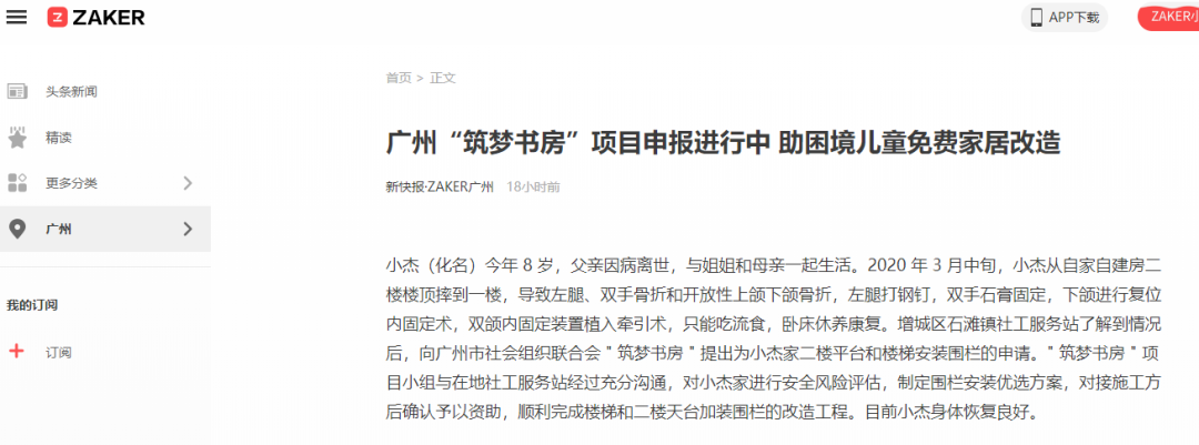 小杰(化名)今年 8 岁,父亲因病离世,与姐姐和母亲一起生活。2020 年 3 月中旬,小杰从自家自建房二楼楼顶摔到一楼,导致左腿、双手骨折和开放性上颌下颌骨折,左腿打钢钉,双手石膏固定,下颌进行复位内固定术,双颌内固定装置植入牵引术,只能吃流食,卧床休养康复。增城区石滩镇社工服务站了解到情况后,向广州市社会组织联合会 " 筑梦书房 " 提出为小杰家二楼平台和楼梯安装围栏的申请。" 筑梦书房 " 项目小组与在地社工服务站经过充分沟通,对小杰家进行风险评估,制定围栏安装优选方案,对接施工方后确认予以资助,顺利完成楼梯和二楼天台加装围栏的改造工程。目前小杰身体恢复良好。