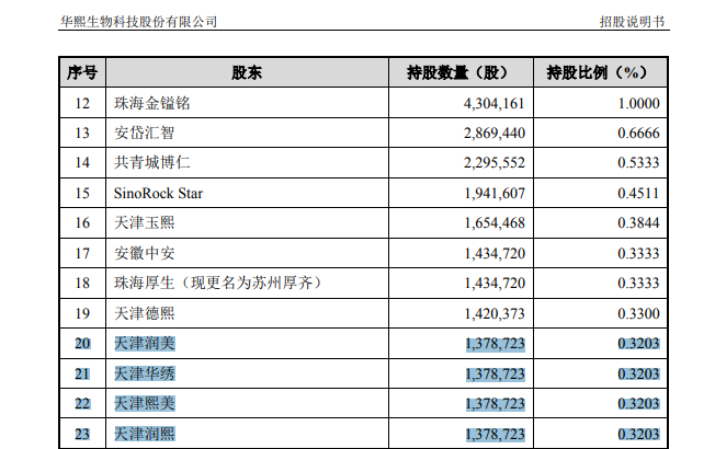 红星资本局从华熙生物上市前的招股书中注意到,上述4家有限合伙企业的持股数量分别约为137.87万股,持股比例分别为0.3203%,共占比约1.28%。