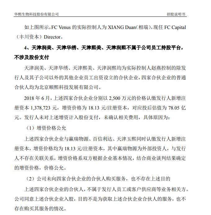 华熙生物称,上述4家有限合伙企业均为实际控制人赵燕控制的除华熙生物及其子公司以外的其他企业员工出资设立的合伙企业,4家合伙企业的普通合伙人均为北京顺熙科技发展有限公司。2018年6月,上述4家合伙企业分别以2500万元的价格认缴华熙生物新增注册资本137.87万元,增资价格为18.13元/注册资本,对应投后估值为78.05亿元。华熙生物未对上述增资计入股份支付,未确认相关费用。