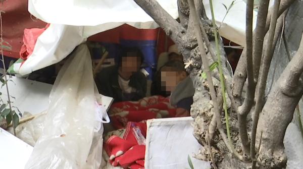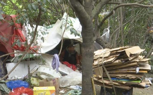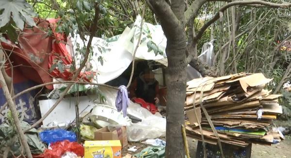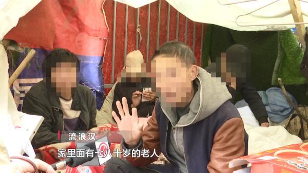 流浪汉:我们落难了,在这里生病回不去了。也赚不到钱,没有路费钱回家,就搭了个棚子在这里捡垃圾卖,有路费钱就可以回家了。