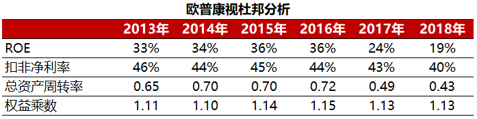 02 模式进化进行时,ROE下滑在所难免在看公司ROE的时候,相信有的朋友们已经发现欧普康视自2016年上市以来,ROE走上了下坡路,其背后是扣非净利率和总资产周转率的大幅下滑。