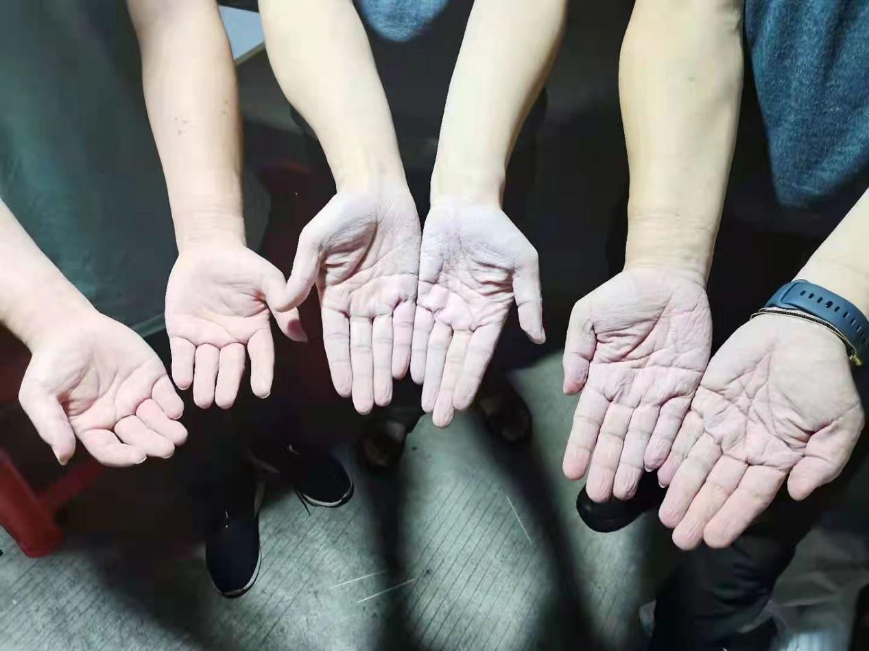此次,龙岗区妇幼保健院参与的多是园山街道西坑、安良、大康社区的居民核酸检测筛查任务,因检测量大,任务重,出征人员经常从清晨工作到深夜。密不透风的防护服,遇上夏日高温,汗水浸透了衣服都能滴出水来,双手也被手套捂得发白。
