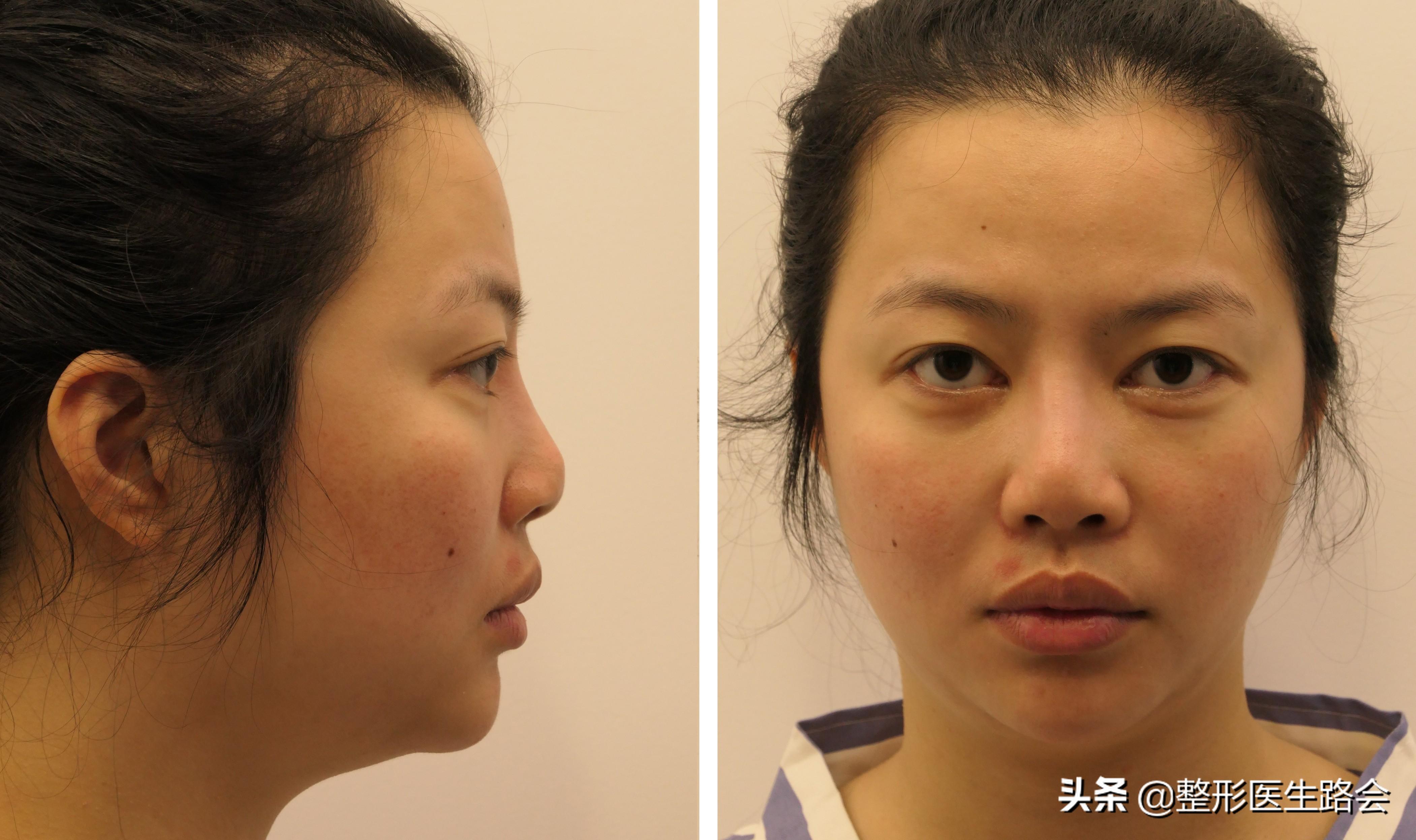 小姑娘的鼻子有些朝天,鼻头几乎是平的,从侧面看则更加。并且,植入的硅胶假体出现显形,歪斜等问题。