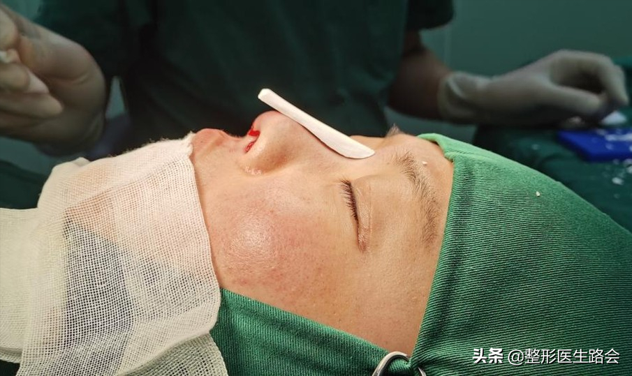 当把原有植入物取出,对鼻子内部的瘢痕情况进行处理后。会将雕刻好的膨体放到鼻子上做对比,如果不合适,还会再次调整,直到形态满意为止。
