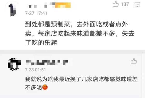 对此,不少网友在社交媒体上分享自己的感受:“预制菜彻底摧毁了我吃外卖的动力,也包括一些堂食。”“在追求降本增效的餐饮行业,标准带走野趣,只剩下统一的味蕾在哭泣了。”