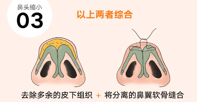 3 混合型顾名思义,混合型就是混合了以上两种问题:鼻头肉多+鼻翼软骨外扩发达解决方式需要结合两种手术方法,去除部分软组织+内收鼻翼软骨,外加植入自体软骨增加鼻头的支撑力,使鼻头增高。