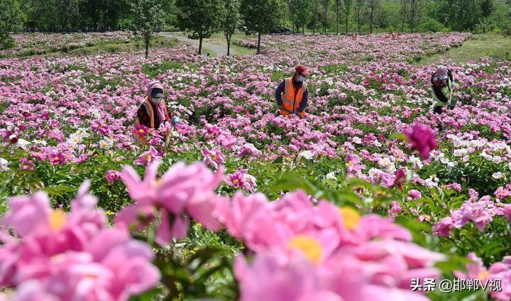 2022年5月13日,邯郸市丛台区紫山公园的工作人员在管理芍药。近日,邯郸市丛台区紫山公园内数万株芍药竞相绽放。紫山曾经是一座废弃矿山。近年来,丛台区持续推进生态环境治理,实施了紫山区域废弃矿山整治、生态修复和景观提升工程,昔日废弃矿山,如今成了市民休闲打卡的生态氧吧。 河北日报通讯员郝群英摄