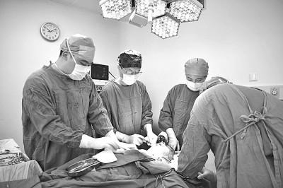 南方医科大学南方医院整形外科主任胡志奇(左二)为“面具男孩”周涛做手术。新华社发