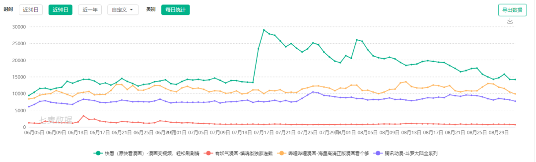 在同一份公开信中,陈安妮谈到“快看APP新的用户总量已经突破3.4亿,Z世代用户占比在90%~94%之间,各端产品总月活近5000万,达历史新高”。七麦数据显示,快看在ios端近90天下载量、应用榜单排名均超过了其主要竞争对手哔哩哔哩漫画、腾讯漫画和有妖气漫画。
