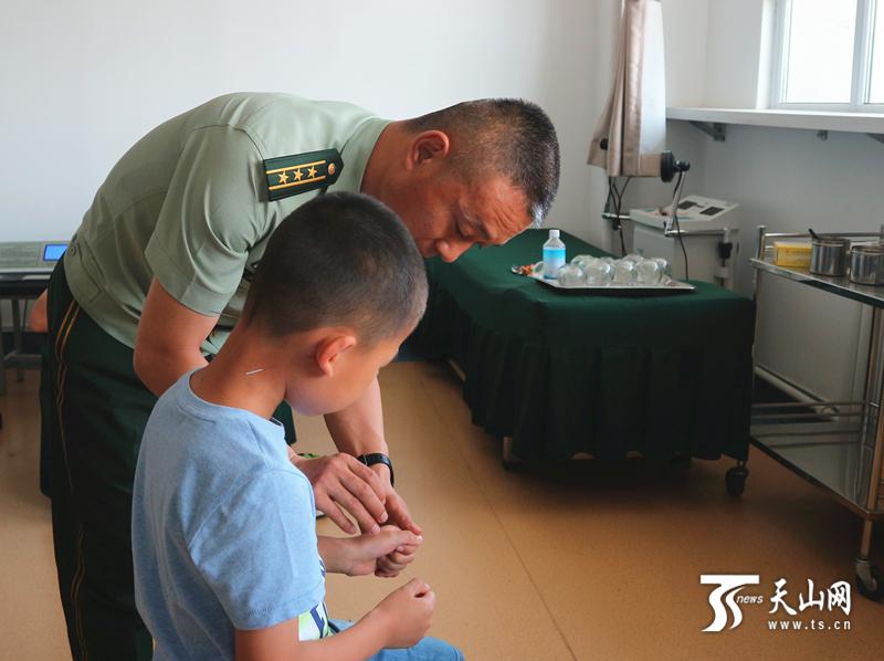 7月30日,从早上开始,武警新疆边防总队医院副院长、中医科主任王允若的诊室里患者就接连不断,他刚给这位把脉、开好药方,就立刻跑到调节室,给那边的患者施针、推拿。