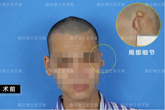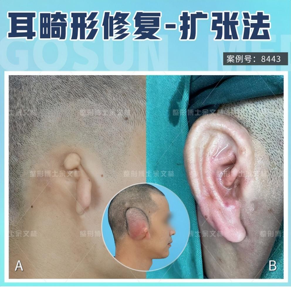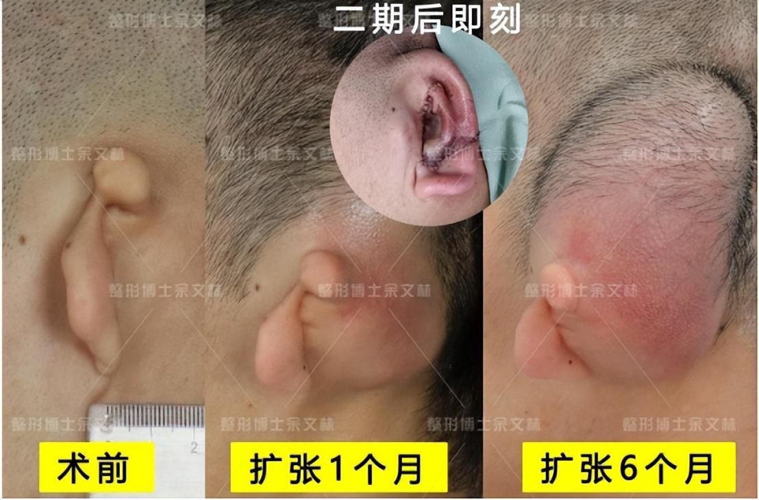 手术要点:手术。一期手术埋置扩张器,定期往扩张囊里注水,扩张皮肤4个月。术后半年行二期手术,切取肋软骨雕刻成耳支架,植于扩张好的皮肤中,调整好位置后固定在耳部,后负压吸引,让耳廓得以显现。再过半年后进行三期手术,修整耳部。